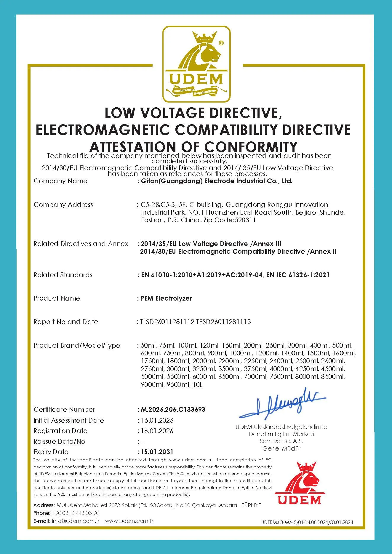 Gitan (Guangdong) Electrode was established in 2022. It is a national high-tech enterprise focusing on the research, development, production and sales of high-performance CCM membrane electrodes, PEM electrolysers and alkaline water electrolysers, as well as related supporting accessories.